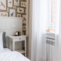 Гостю предлагается мягкий халат и тапочки. Домашний уют в номере также создаёт текстиль из натуральных материалов – постельное бельё, плед, подушки, шторы.