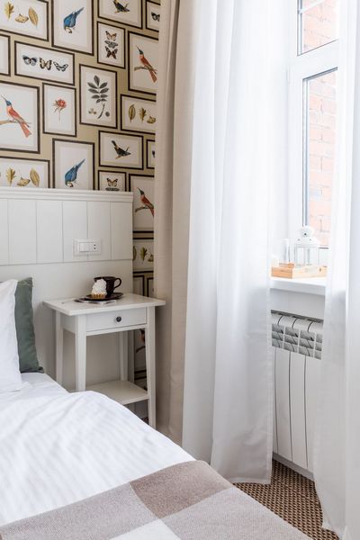 Гостю предлагается мягкий халат и тапочки. Домашний уют в номере также создаёт текстиль из натуральных материалов – постельное бельё, плед, подушки, шторы.