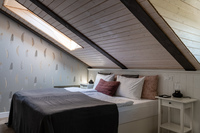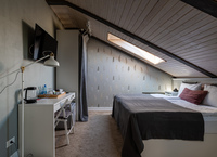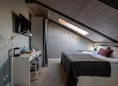 Изюминкой этого мансардного номера является ниша, которая очень нравится нашим маленьким гостям. Помимо ниши этот номер площадью 23 м² обладает всеми остальными атрибутами нашего места: двуспальной кроватью «king size» (180×200), шкафом для вещей и двумя мансардными окнами, одно из которых смотрит на Оптину Пустынь.